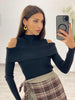 Maglia a costine taglia unica elasticizzata con spalline scoperte e mezzo collo.