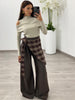 Pantalone vita alta non elasticizzato con chiusura zip e bottone ed elastico sul retro, ha le pences sotto la pattina a quadroni in flanella che vedete sovrapposta. La pattina è cucita e pezzo integrante del pantalone ed è regolabile grazie al laccio sul fianco. Questo articolo veste fino alla L. Misure ragazza in foto 1,60/XS